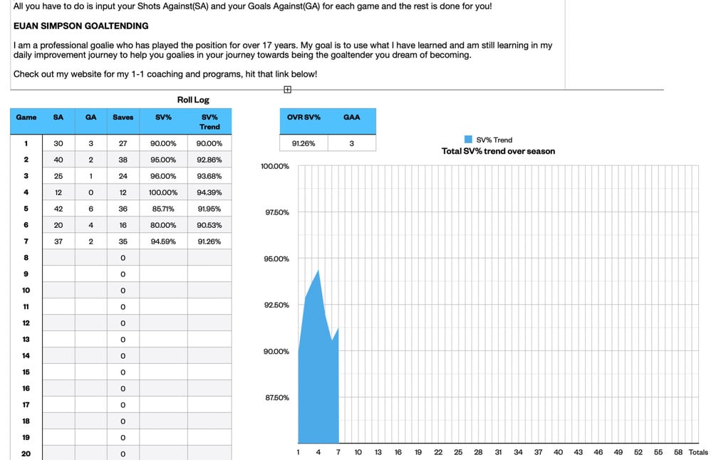 All you have to do is input your Shots Against(SA) and your Goals Against(GA) for each game and the rest is done for you!